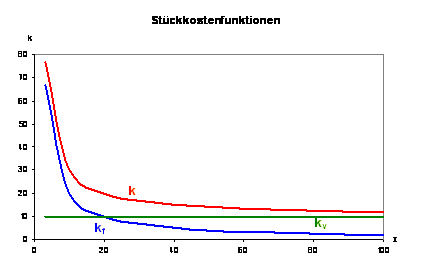 Stückkostenfunktionen ist wichtig, dass die Kurve der variablen Stückkosten als Parallele zur x-Achse verläuft, in unserem Beispiel bei dem Wert 10. Die Kurve der fixen Stückkosten nähert sich bei zunehmender Ausbringungsmenge immer stärker dem Wert 0, ohne diesen je zu erreichen. Die Kurve der gesamten Stückkosten nähert sich immer stärker dem Wert 10, also den variablen Stückkosten, ohne diesen je zu erreichen.
