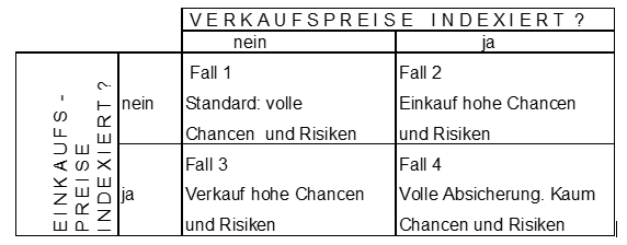 Fall 1: Ohne Indexierungen und Festverträge hat das Unternehmen die vollen Risiken, aber auch die vollen Chancen von Preisänderungen. Es sollte ein hohes Knowhow in den jeweiligen Märkten aufweisen. Auf der Einkaufsseite muss es hohe Mengen ordern, wenn es Preissteigerungen erwartet. Auf der Absatzseite sollten Verträge schnell abgeschlossen werden, wenn Preissenkungen bei den Rohstoffen erwartet werden.