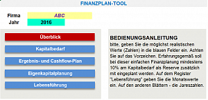 Dies ist ein einfaches Excel-Tool zur Verschaffung eines Gesamtkapital-Überblicks einer Start-up-Planung. Das Tool hat ein Menüblatt, auf dem man die einzelnen Register auswählen kann. Bitte tragen Sie im Menüblatt den Namen und das Startjahr ein. Nachdem alle blauen Register ausgefüllt sind, erhält man im Register „Überblick“ alles zusammengefasst.