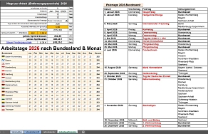 Lohnsteuerformular: Dies sind Parameter für die Berechnung der Steuer Pendlerpauschale. Hierbei werden die orangenen Felder ausgefüllt (siehe Voreinstellungen) und die weißen Felder automatisch ergänzt. Mit dabei, eine Liste der Arbeitstage für jedes Bundesland und eine Liste der Feiertage für Deutschland. Beachte: Jedes Bundesland hat hierzu seine eigenen Feiertage. Diese sollte man zusätzlich nachtragen.