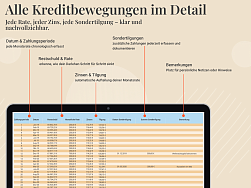• Exakte Restschuld-Berechnung: Behalte jederzeit im Blick, wie viel deines Kredits noch offen ist – inklusive Endzahlung und Zinsstatus.
