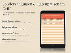 • Flexible Sondertilgungen & Ratenpausen: Plane zusätzliche Zahlungen oder setze Raten temporär aus – der Rechner erkennt automatisch, wenn eine Pause zu hoch ist.