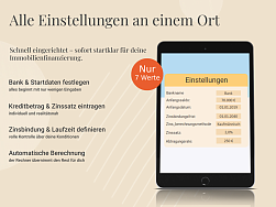 • Alle Einstellungen an einem Ort: Nur 7 Eingaben nötig – Bank, Startdatum, Zinssatz, Rate, Laufzeit u. v. m.